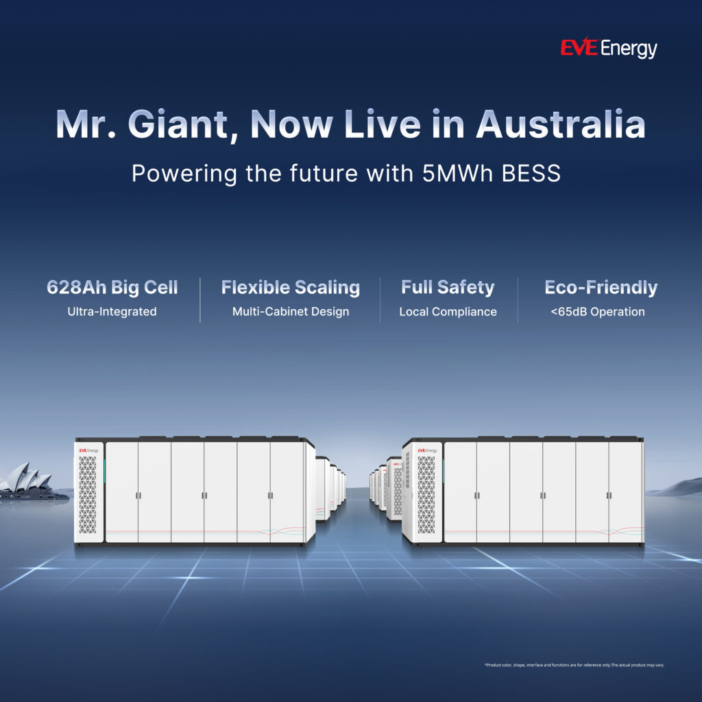 EVE Energy has achieved a significant milestone in its global commercialization of large-scale energy storage solutions with the deployment of its Mr. Giant system in Australia. The system utilizes 628 ampere-hour (Ah) battery cells and highlights the company’s capabilities in system design, manufacturing and international project delivery.