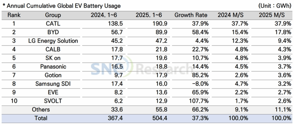 - SK On saw 10.7% growth (19.6 GWh), securing fifth place.