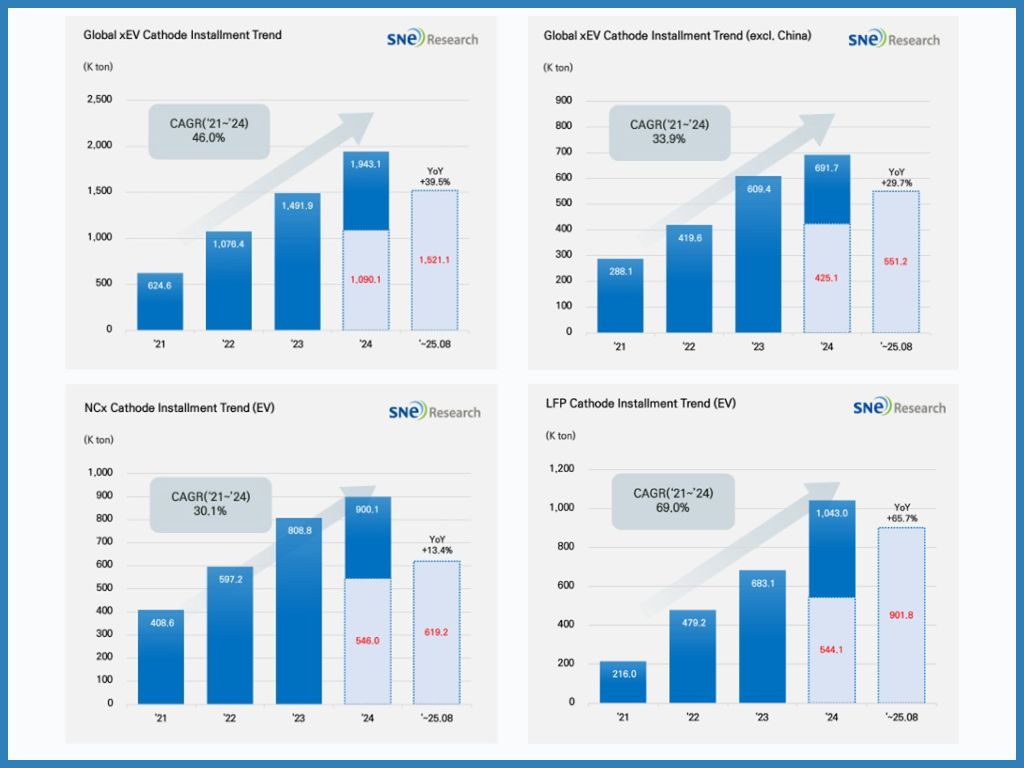 Between January and August 2025, global installations of cathode materials for electric vehicles (EV, PHEV, HEV) reached approximately 1.521 million metric tons, representing a 39.5% year-on-year increase. Installations outside China accounted for about 551,000 metric tons, up 29.7% compared to the same period in 2024.