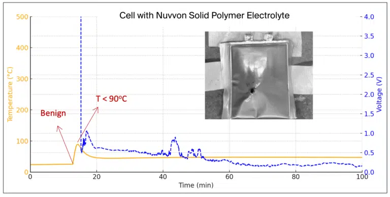 On October 15, 2025, Nuvvon announced that its proprietary solid polymer electrolyte (SPE) successfully passed rigorous nail penetration tests in commercial-grade, 1 Ah cells based on Graphite-NMC811 and Lithium-NMC9 chemistries. Conducted independently at The University of Texas at Austin, these tests simulate internal short circuits by driving a nail through fully assembled cells. While cells containing a conventional liquid electrolyte exploded immediately upon penetration, neither of the SPE-based cells ignited or erupted.