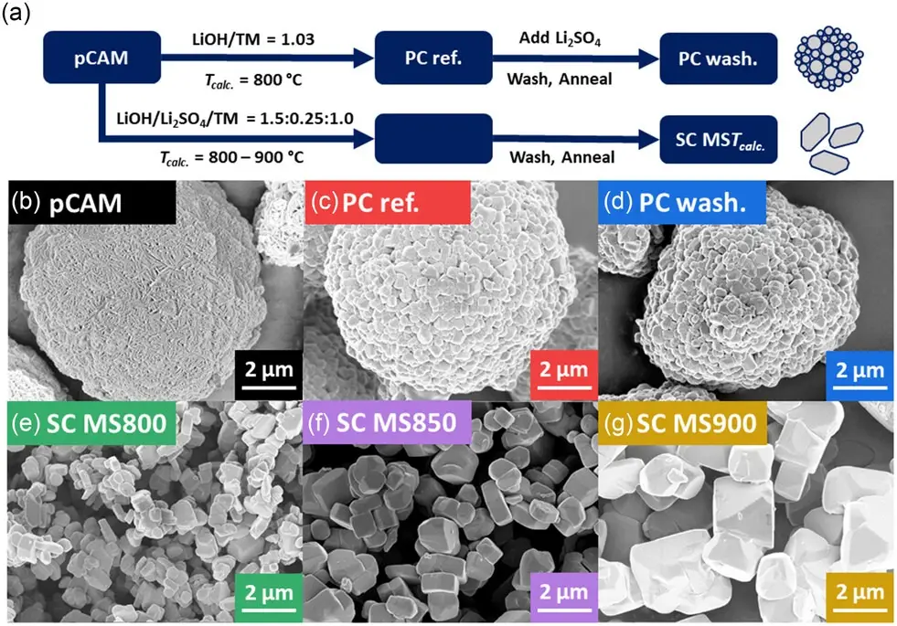 Researchers from the University of Münster, the MEET Research Center, and the National Taiwan University of Science and Technology have demonstrated superior performance of single-crystal (SC) nickel-rich cathode materials compared to traditional polycrystalline (PC) versions for lithium-ion batteries. The study, published in Small Structures, systematically compared SC and PC NMC811 (LiNi0.8Mn0.1Co0.1O2) cathodes synthesized from identical precursors.